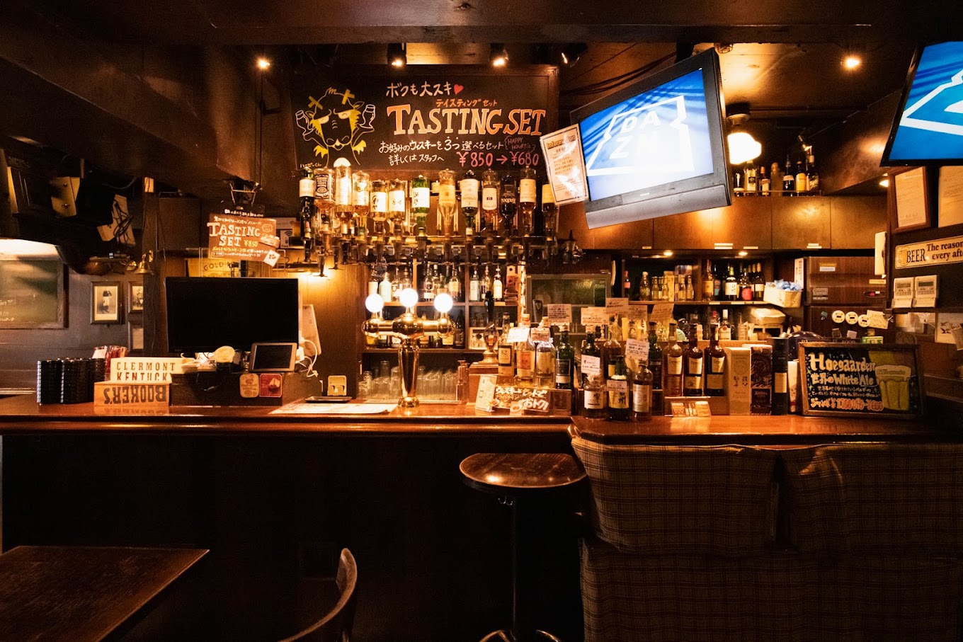 様々なお酒が並ぶカウンターは見ているだけでもワクワク♪世界各国のお酒をリーズナブルな価格で取り揃えてます!本場のPUBさながらの英国調の店内は素の自分に戻れる場所です。