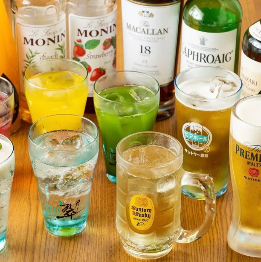 宴会コースの飲み放題に加え、単品でのご予約も可能!定番の生ビールはもちろん、レモンサワー、ジムハイボール、翠ジンソーダなどイマドキのドリンクに、いちじく&かぼす柚子などのフレーバーを加えたバリエーション豊かなラインナップ!さらには15時スタートと早い時間から飲めるのも嬉しいポイント★