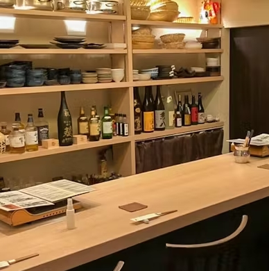 心斎橋からほど近い立地でありながら、都会の喧騒を感じさせない落ち着いた店内がお客様をお出迎えいたします。店内に入ると目を引く、一枚板のテーブルは立派な栃木の一枚板を贅沢に5分割したもので、木のぬくもりを感じていただける拘りの作りです。