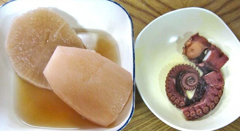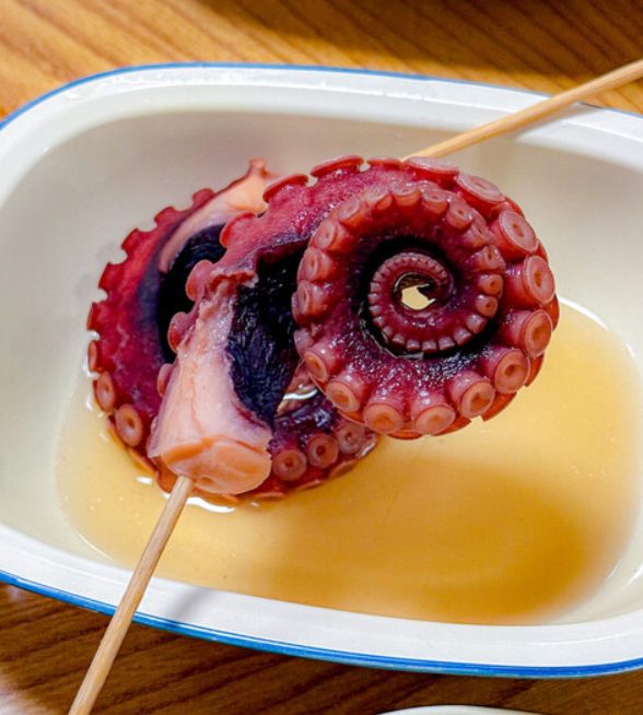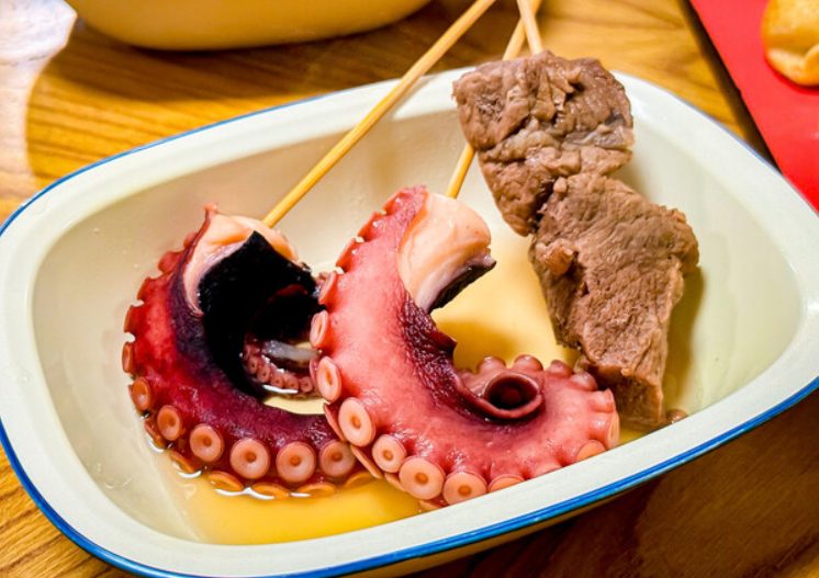 ほんのり甘めのだしでじっくり煮込まれたおでんは、素材の旨味をしっかり引き立てる上品な味わい。中でもタコ入りおでんは、やわらかさと弾力のバランスが絶妙で、噛むほどに旨味が広がる人気の一品。スタッフが丁寧にカットしてくれる気配りもうれしいポイントです。