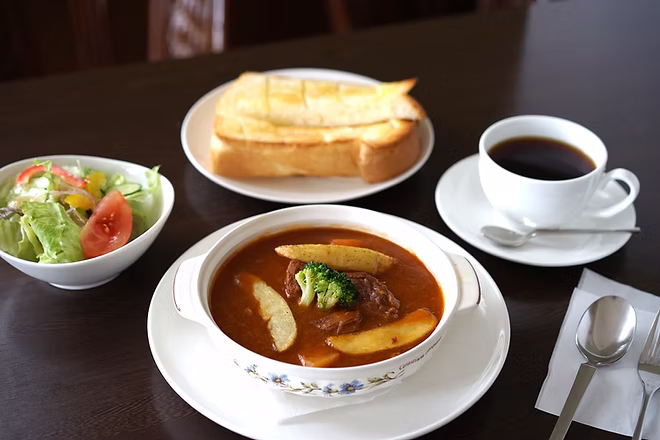人気のビーフシチューセットや自家製ピザ、焼きたてアップルパイなど、コーヒーと一緒に楽しめるメニューが充実。ランチやカフェタイムにもぴったり。