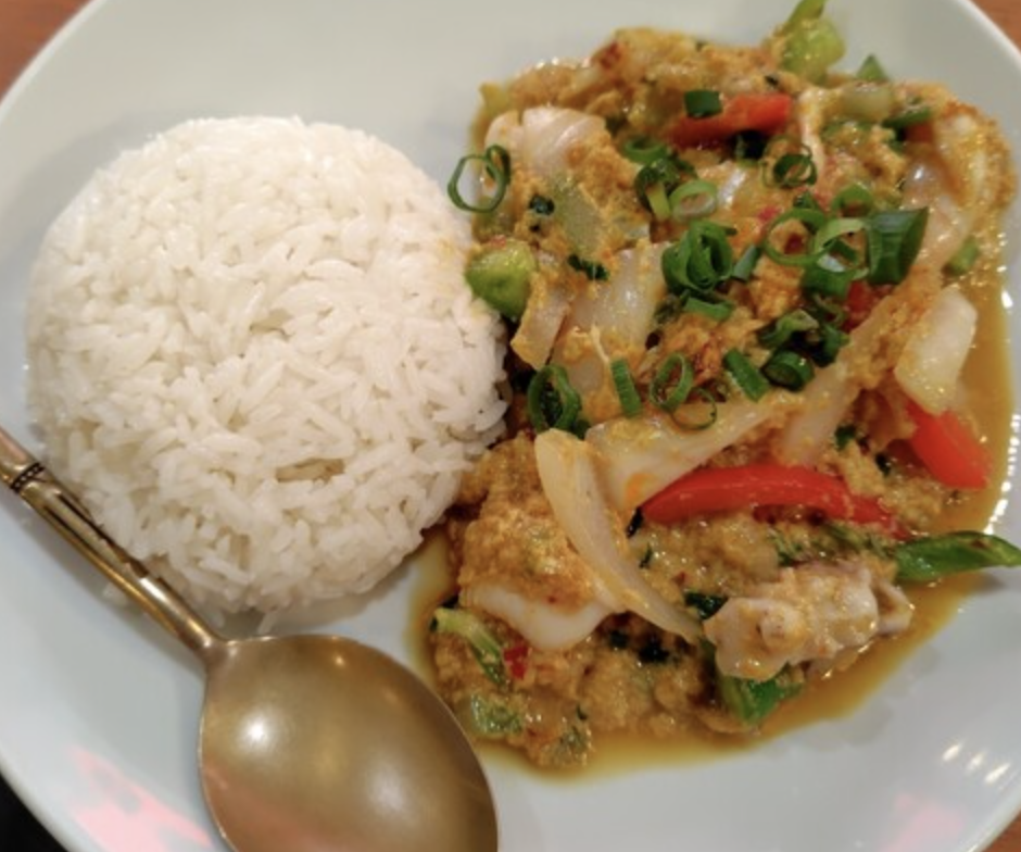 海鮮パッポンカリーセットは絶品。食べ放題のサラダ、スープ、焼きビーフンも魅力的で、特にサウザンアイランド風のサラダドレッシングは辛味が効いています。
