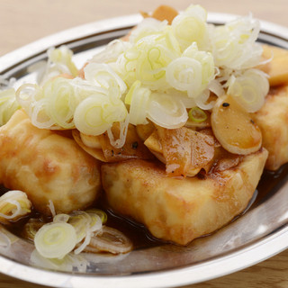当店イチオシの『馬力とうふ』は、絹ごしとうふを揚げ出しのようにサクサクに揚げて、かりかりのガーリックチップとバターしょうゆ風味の甘辛たれ、しゃきしゃきのねぎをたっぷり乗せた逸品!