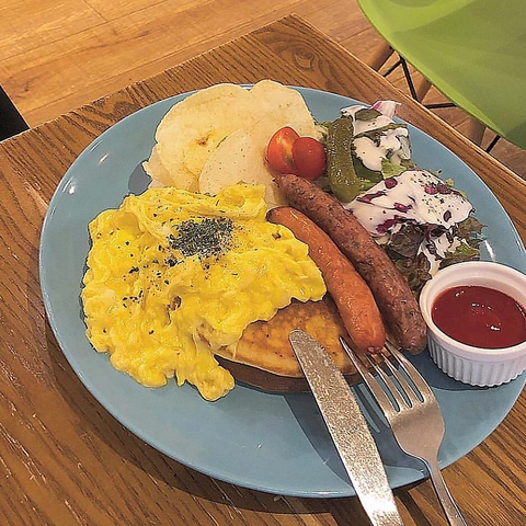 2種類のグリルソーセージとトロフワエッグのパンケーキはとってもボリューミー!パリッとジューシーなソーセージとふわっふわなスクランブルエッグの食感の違いがたまらない!甘さひかえめなパンケーキとの相性は抜群です♪ぜひご賞味ください!