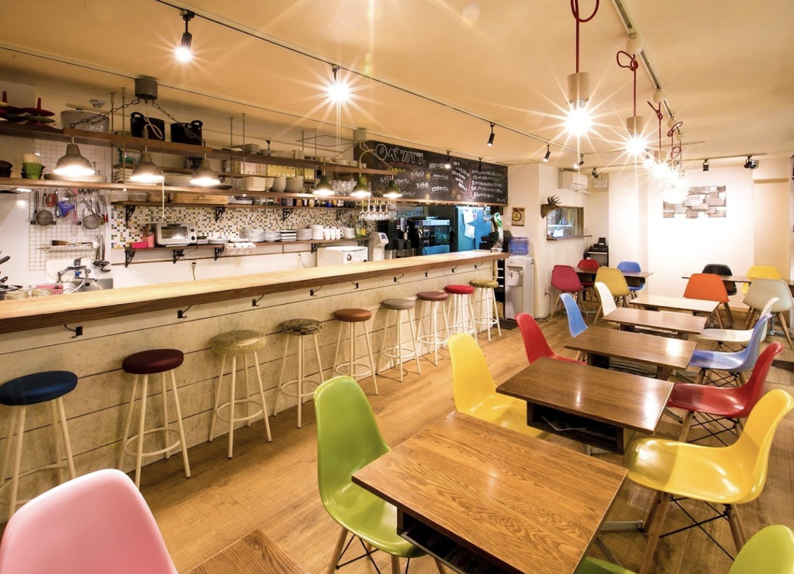 カラフルなイスが並ぶポップな店内♪