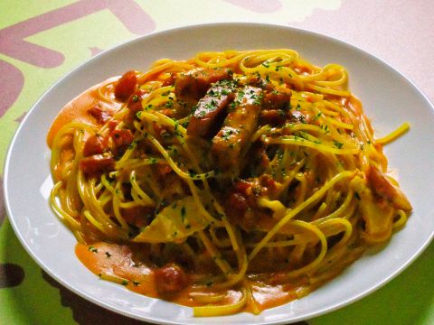 10年間イタリアンで修業したシェフが手がけるパスタは必食。カマンベールチーズとベーコンのトマトクリームスパゲティは、濃厚なチーズのコクとシコシコ食感の麺が絶妙に絡み合う逸品です。もともとパスタ店ならではの本格的な味わいが楽しめます。