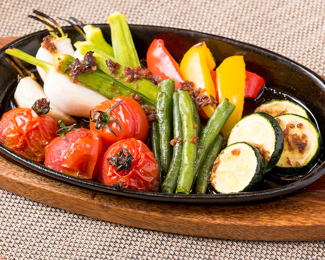 カラフルな旬野菜をたっぷり6種類使用した「彩り野菜のオーブン焼き」950円(税込)。ジュージューと音をたてる熱々の鉄板でテーブルまでお届けします。オーブンで焼き上げ、ほどよく付いた焦げ目もご馳走!にんにくとアンチョビを使用したオイルベースの自家製ソースが野菜本来の旨味を引き立てます!