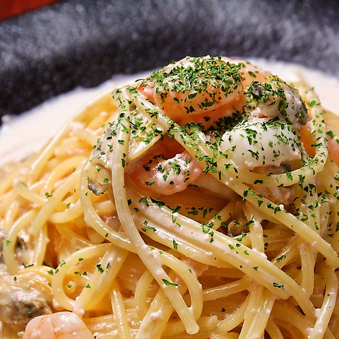 ぷりぷりの海老、イカ、ホタテを贅沢に使用。コクのある明太子クリームソースと海の旨みが口いっぱいに広がるおすすめの一皿。
