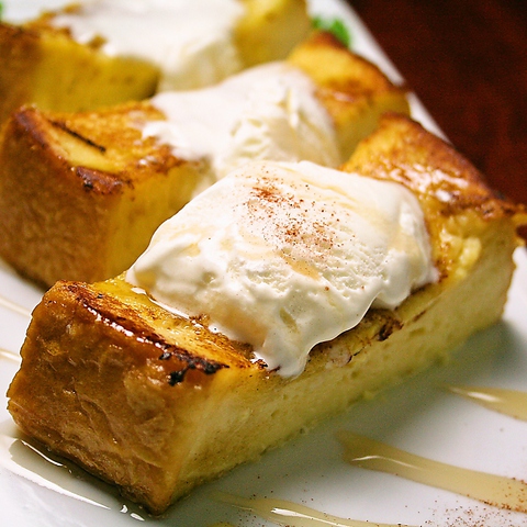 とろける食感のフレンチトーストをバターで香ばしく焼き、バニラアイスとシロップをかけた贅沢デザート。