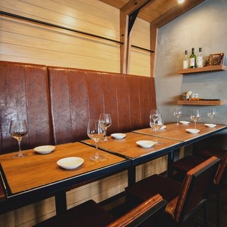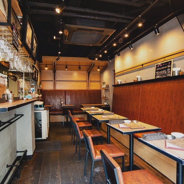 カウンター席、テーブル席、立ち飲み席の3種類をご用意しており、総席数は18席。ブラックや木目模様を基調としたクラシックで落ち着いた店内で、食事や会話を楽しめる賑やかな空間になっております!