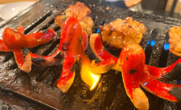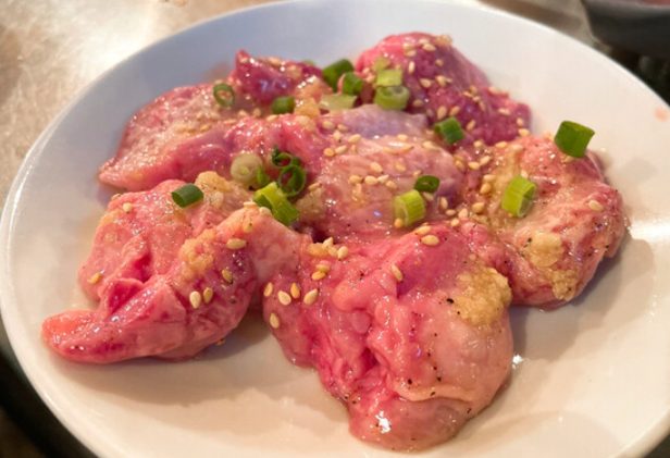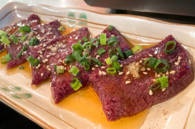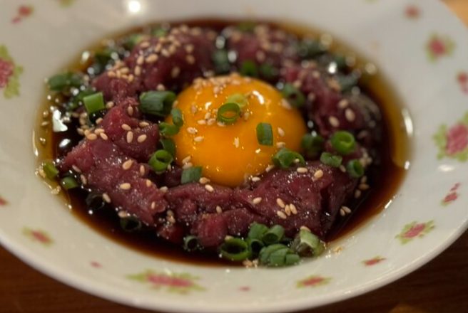名物「一本ホルモン」は鉄板の上で大胆に焼き上げ、ハサミで切りながらいただくスタイル。脂のノリと弾力がクセになる逸品です。焼き物はもちろん、白センマイ刺しやさくらユッケもおすすめ。