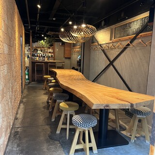 素材の質感が活かされたお洒落な空間。木の温もりが感じられる店内を、照明が優しく照らします。お席はカウンター席とテーブル席をご用意。カウンター席は卓上に緑が活けられており、どこかほっとする雰囲気が漂います。お仕事帰りのお食事などカジュアルなご利用にもどうぞ!大きな木のテーブル席は団体様でのお食事にも最適です。