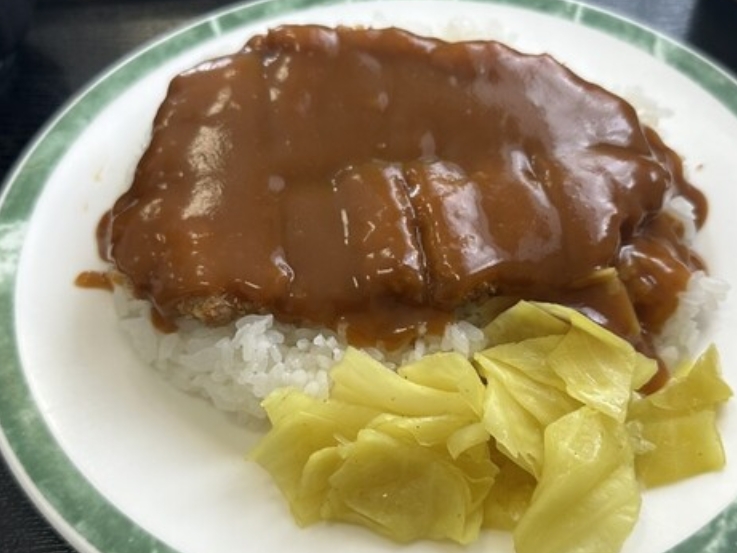 ロッキー食堂名物のカツメシは、ビーフ・ポークから選べる大人気メニュー。酸味とコクのバランスが絶妙な特製デミグラスソースがカツとご飯に絡み、最後まで飽きずに楽しめます。
