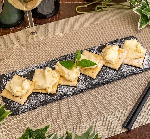 【焼き鳥だけじゃない☆大魔王HOUSEの魅力】単品のお料理も大人気!ファン多数の看板メニュー〈ハニークリームチーズ〉クラッカーの上にオリジナルクリームチーズとハチミツをかけたおつまみにもデザートにもピッタリ!ワインやカクテルとの相性抜群☆ついついおかわりしちゃう方もたくさん!ぜひご堪能下さい