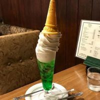 まるで逆さまにしたソフトクリームをメロンソーダの中に入れたかのような「クリームソーダ」があります!