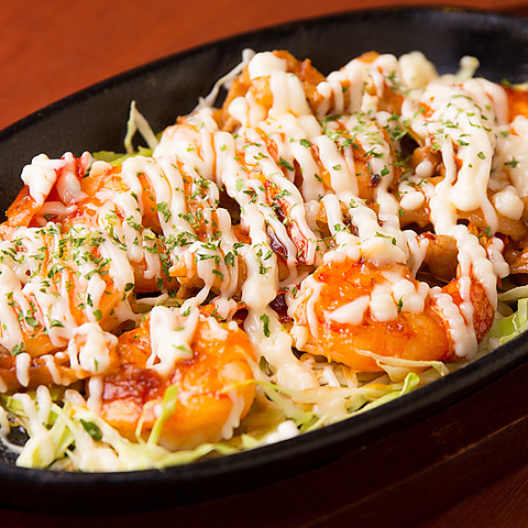 エビにマヨネーズをたっぷりとかけた海鮮鉄板焼きです。試行錯誤した、こだわりのオリジナルレシピで作るソースをかけてどうぞ召し上がれ!