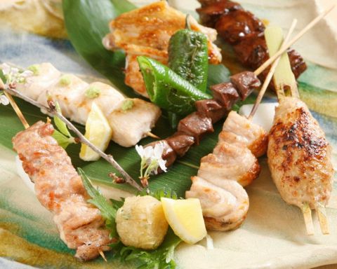 名古屋コーチン、筑波地鶏、軍鶏を使った焼き鳥が自慢!!紀州備長炭の炭火と職人の熟練技で、香ばしく焼き上げます。適度な弾力があり、歯ごたえ抜群のジューシーな鶏肉の味をたっぷりとお楽しみ下さい。