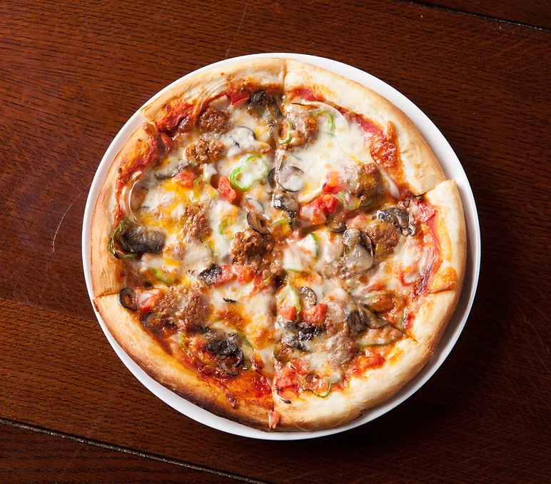 エイトタップスピザ!オリジナルピザソース、8種の具材、他にも3種のチーズを使用!具だくさんの8taps自慢のごちそうピザです!