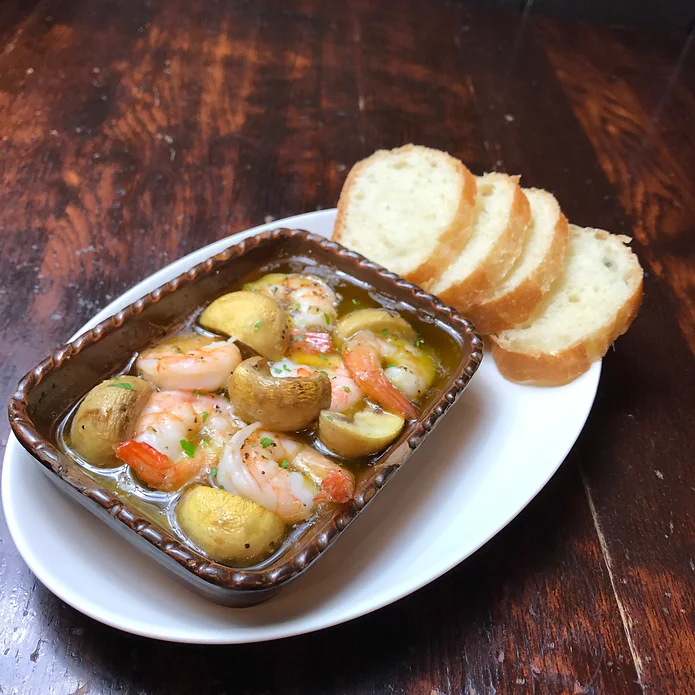 エビとマッシュルームのアヒージョ! プリプリエビとマッシュルームをガーリックオイルで熱々に仕上げました!ぜひご賞味ください!