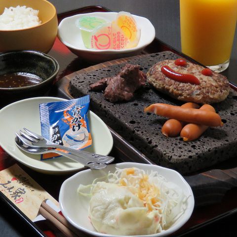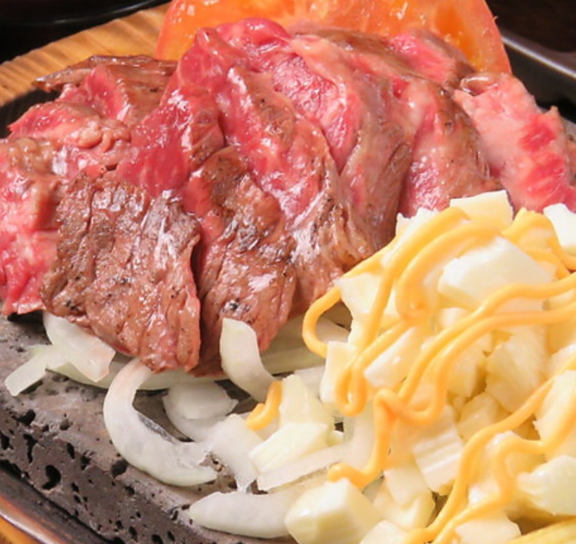 お店一押し!えん家のリーズナブルな定番肉!お肉屋直営の美味しいお肉を溶岩石でどうぞ!特製の味噌ダレor醤油マスタードで♪※+495円(税込)で御膳セット(白ご飯・サラダ・味噌汁・お新香)もOK!お昼も夜も無料で季節の炊込みご飯御膳に変更OK!※写真はイメージです。