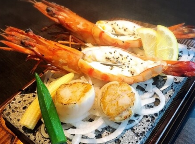 【えん家ステーキと新鮮な有頭大海老】、【牛ヘレステーキと有頭大海老】、【牛サーロインステーキと有頭大海老】など選べる御膳セット♪※+495円(税込)で御膳セット(白ご飯・サラダ・味噌汁・お新香)もOK!お昼も夜も無料で季節の炊込みご飯御膳に変更OK!★※写真はイメージです。