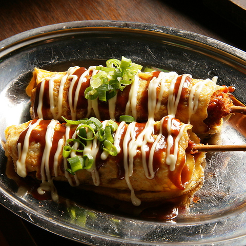 オムカツ!食べて驚く新食感!!卵にくるまれている串カツがサクサク!マヨソースとの相性も抜群でついついお替りしたくなっちゃう一品です!女性にもご好評いただいている一品でリピーター多数の人気商品!