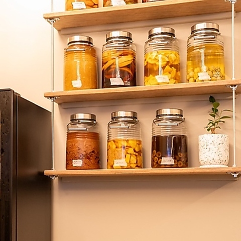 店内入って目につく、瓶につめられたフルーツたち。オーナー南さんがつけた果実酒だそう。季節の果実を味わう贅沢をここで!