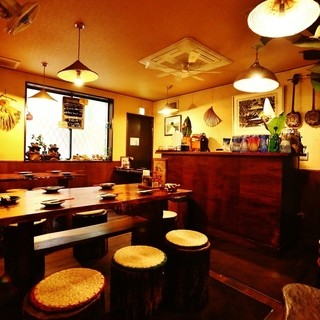石垣島の伝統工芸品≪ミンサー≫柄の陶器や、色鮮やかなグラスなどの食器をはじめ、テーブルや椅子などの木材はすべて沖縄原産のもののみ使用!