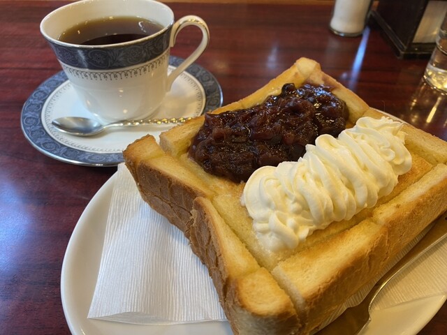 懐かしい喫茶店で、常連客が多く、居心地が良い雰囲気が漂っています。小倉トーストは特に人気で、分厚いサックサクのトーストにたっぷりのあんことクリームが絶妙に組み合わされています。