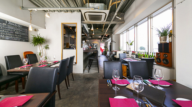 6階からの眺めを楽しみながら、白壁と黒インテリアでまとめられた落ち着いた空間で食事ができます。カウンター席ではワインバーとして1杯から、テーブル席ではデートや家族団らんも可能。夕方から深夜まで利用でき、日常使いから特別な夜まで幅広く対応しています。