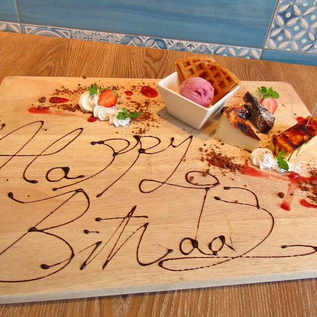 誕生日など、大切な記念日に心のこもったデザートはいかがですか?お好きなメッセージをお入れ致します!当店こだわりのデザートプレートが大切な記念日の演出をお手伝い致します。※キャラクター、人物等のデザインは承っておりません、ご了承お願いいたします。※前日までにご予約下さい(当日の場合は直接ご相談ください)※店内込み合いによって提供が遅れる場合がございます、不明な点などあればお気軽にご相談下さい。