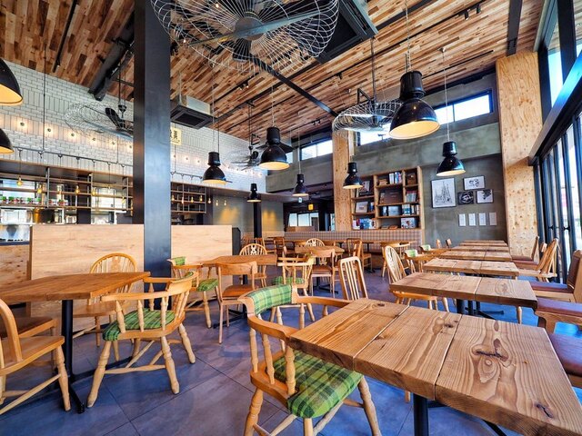 店内は天井も高くウッド調が素敵な造りでホッと一息できる空間です♪食後は会話を楽しんだり、読書をしたりおくつろぎいただいています。今の時期ならお天気が良いときは青い空の下、テラス席で食事もおすすめです。高台に位置しているので風も心地よく、夕方時は赤く染まった光が幻想的です♪夜が過ごしやすくなってきた今、テラス席はおすすめです♪また、各種ご宴会やお集まりなどの貸切のご相談はお気軽に店舗にご連絡下さい♪