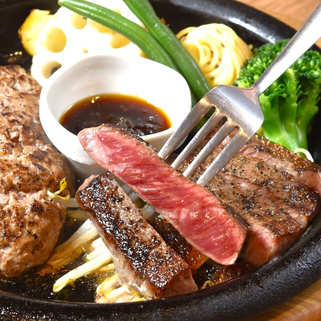 当店看板メニューのハンバーグには、新鮮な黒毛和牛を100%使用。赤身と脂身のミンチを黄金比で配合し、つなぎもほとんど使用せず、季節や気候に合わせて微調整するこだわりの製法で作り上げています。焼き方はレアがおすすめですが、苦手な方は鉄板でお好みの焼き加減に調整可能。