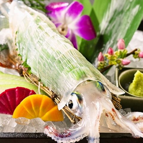 ご注文を受けてからさばく、ヤリイカの活き造りはお口に入れた瞬間にコリコリとした食感と甘み・旨みが広がります!後造りは、天ぷら、塩焼き、刺身の3種からお選びいただけます。※こちらは入荷が安定しないため、裏メニューとなっております。