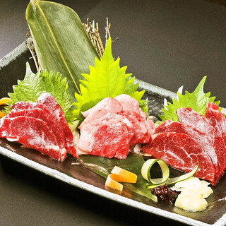 熊本直送鮮馬刺し本場の馬刺しを鮮度抜群で提供柔らかさと上品な甘さと旨味甘口醤油でしょうがを溶かしてネギとにんにくで巻いて食べるのが本場スタイル!