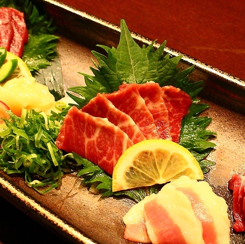 本場熊本県・古閑牧場から仕入れる新鮮な馬刺しは、とろけるような食感と上品な旨みが魅力。ヒレやロース、霜降り特選バラなど多彩な部位を楽しめる盛り合わせも人気です。高たんぱく・低カロリーでヘルシーなのも嬉しいポイント。素材本来の甘みをじっくり味わえる、大人のための贅沢な一皿です。