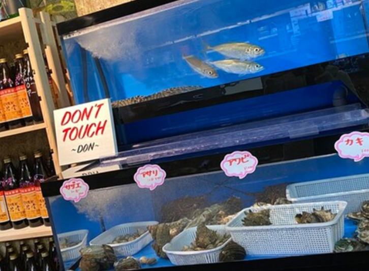 生け簀から取り出し、活魚・貝を焼いてそのまま食べる。サザエ、ホタテ、牡蠣、ハマグリ等々、新鮮な魚介をお召し上がり頂けます。貝の弾ける様子と香ばしい香りが、食欲をそそります。