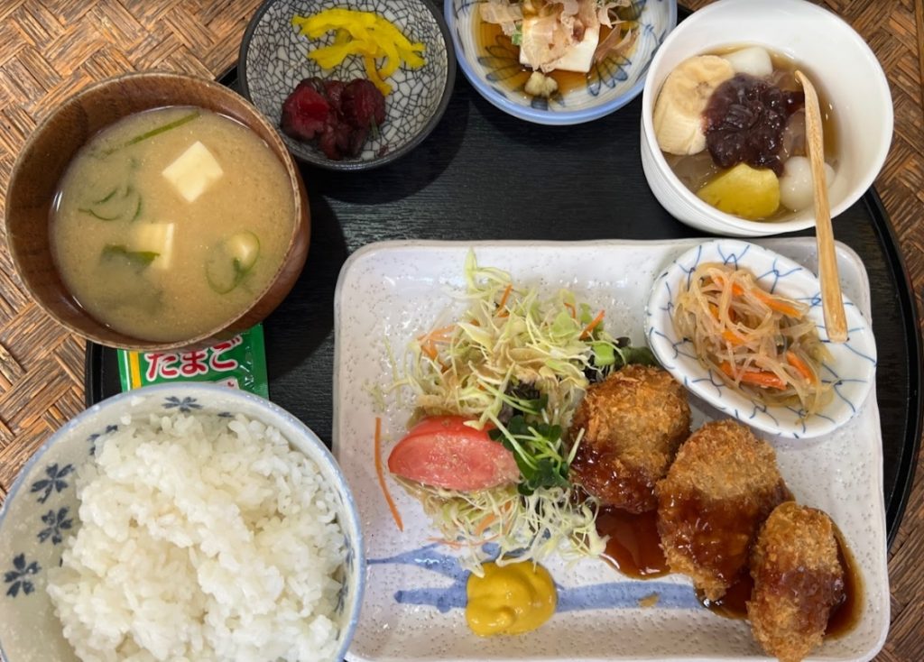 680円で楽しめる日替わり定食はおかずが豊富!ご飯、味噌汁、漬物に手作り白玉あんみつまで付いて、満足感たっぷりです。