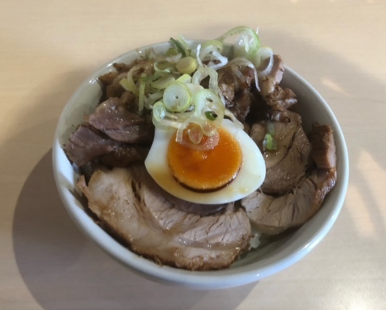 通常のチャーシューに加えて、ほぐしたチャーシューもたっぷり。ミニでもボリューム満点の月見チャーシュー丼は、この店ならではの魅力的な一品。ラーメンとの相性も抜群です。