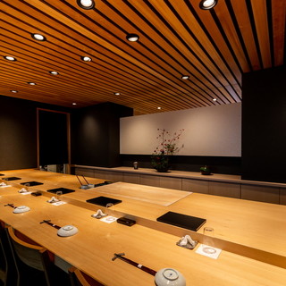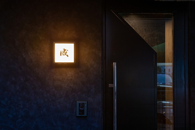西麻布の裏路地に佇むアプローチを入ると小さく光る「成」の看板。ここに鮨屋があるとは思えない特別な隠れ家。インターホンを押し解錠され一歩足を踏み入れると、美しくシックな雰囲気の中にも温かみのある空間。8席の白木のカウンターに座るとお客様の目線がまな板と同じ高さで臨場感も!