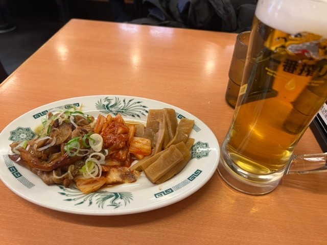 早速提供されるW餃子定食は絶品。野菜炒めと生ビールとの相性も抜群で、美味しく満足度高めです。