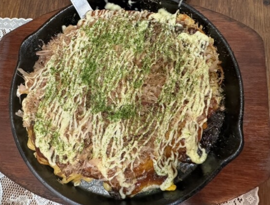 豚肉と卵の間に天かすを挟む独自スタイルが印象的。ソースの甘辛さとマヨネーズの相性も抜群で、どんどん箸が進む軽やかな味わいです。