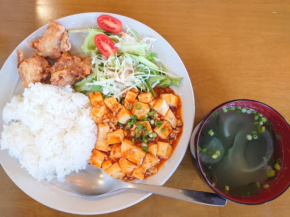 おすすめは1日5食限定の麻婆プレートです。色鮮やかなワンプレートにはシャキシャキサラダとパリッとした唐揚げが添えられ、ピリ辛の麻婆豆腐とご飯で満足感満点。辛味控えめで誰でも楽しめる辛さが魅力です。