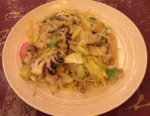 紅燈籠(ホントンロウ)の太麺皿うどんは、熱々の餡と野菜と麺が絶妙に絡み合い、一口頬張るとその旨さが広がります。唐揚げにはニンニクが効いて美味しさを引き立てます。ランチや夕食にぴったりの一品です。