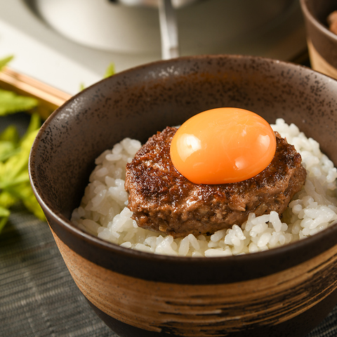 国産A5ランクの牛肉と国産ブランド豚、さらに牛タンをミックスした贅沢なハンバーグ!肉の旨さがガツンとくる人気メニュー!オン・ザ・ライスで卵トッピングでかきこんで下さい!