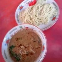 つけ麺には「紅生姜」がアクセント。胡麻風味全快で、辛味のない担々風味。サッパリ感のある生姜焼きと共に楽しむ変わり種つけ麺。