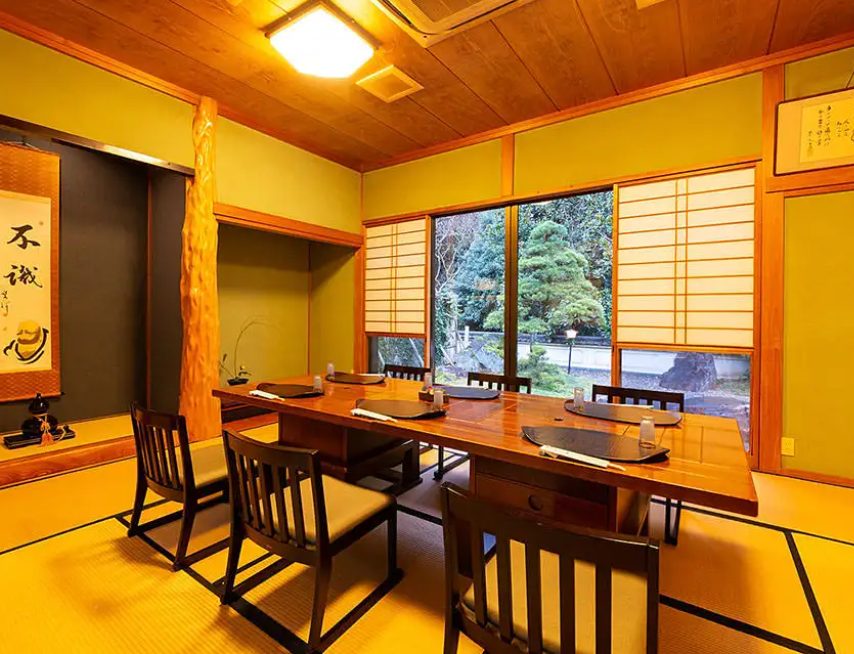 四季折々の美しさに包まれる中津の自然に寄り添うように建てられた離れ空間。窓の外には手入れの行き届いた中庭が広がり、景色を愛でながらお料理を堪能いただけます。日常を忘れ、心安らぐ時間をお過ごしください。