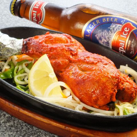 スパイスで味付けしている骨付きチキン♪食べごたえ抜群です!!650円!当店のタンドリーチキンは本格的な窯で1本1本丁寧に愛情込めて焼いています☆たっぷりの、スパイスとヨーグルトの中に漬け込んで中までスパイスが染みた、深みのあるチキンでクセになります♪見かけも辛そうだが、本当は全然辛くない。香り高く、インドの気分。