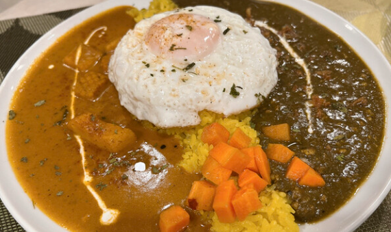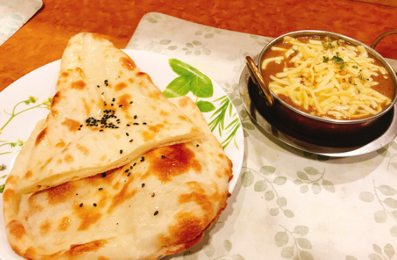 合掛けのチーズキーマとシーフードカレーは見事なマリアージュ。野菜カレーの豆や福神漬け、らっきょうも絶品です。本格的なインド料理を堪能できるお店です。