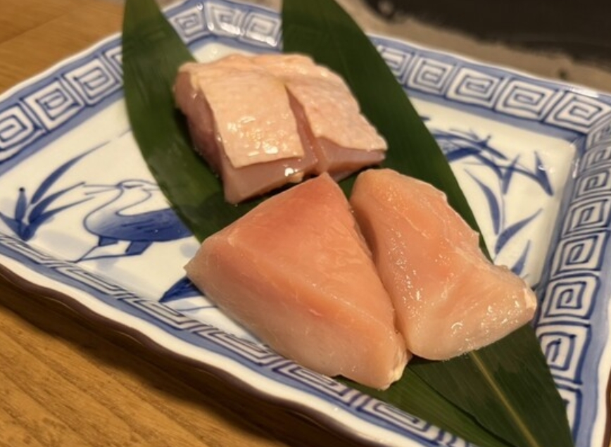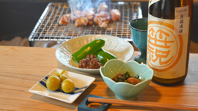 仕入れた後に店内で丁寧に捌いている新鮮な「博多地鶏」は、ぜひ食べて欲しいこだわりの食材。火入れ済みの料理ではなく、囲炉裏の炭火を使いお客様自身で焼いた焼き立てをお楽しみいただけます。選べる味付けは、自家製のたれ・自家製のハーブスパイス・油谷産の高級塩をご用意。地元の味噌を塗ってご提供する「田楽」もご一緒にどうぞ。